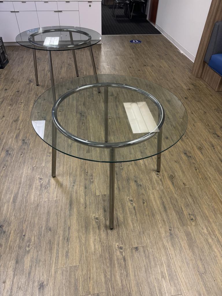 We have these glass tables that are 32” round with a steel base in good condition:m.