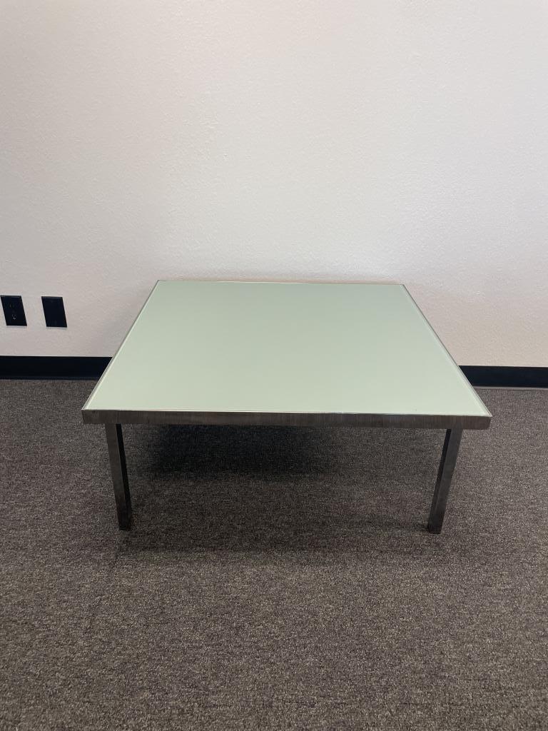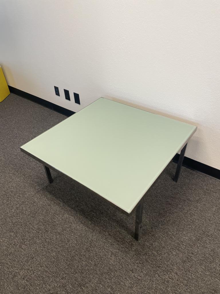 We have this 3’x3’x18” tall occasional table with frosted glass and chrome legs. It is perfect for any reception area or collaboration space.