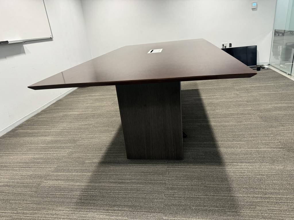 We have this 8’x4’ mahogany top conference table with white bases. This conference table is in good condition and perfect for average size conference room.
