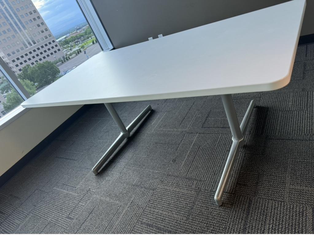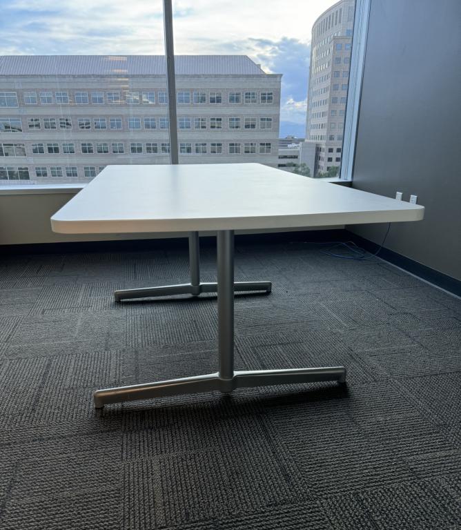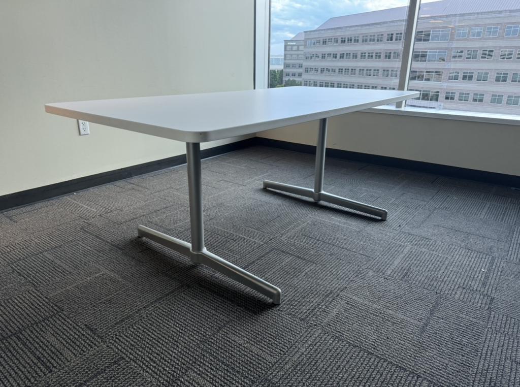 We have these 6’x3’ white top with sicker steel bar conference tables made by Steelcase. These tables are solid and a perfect size for a small conference room or executive office.