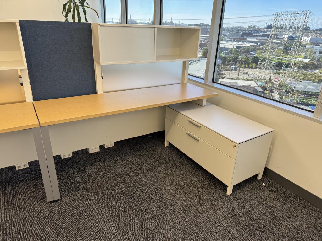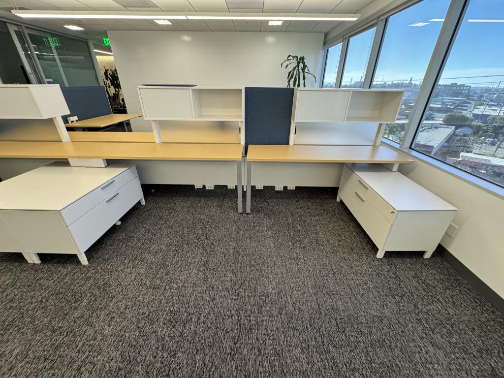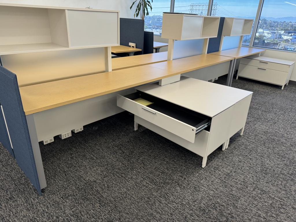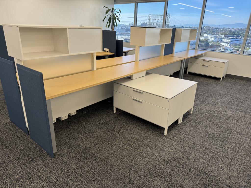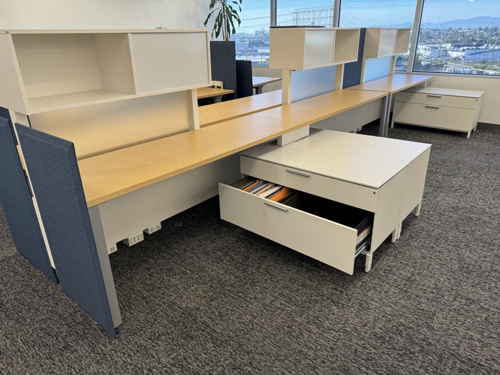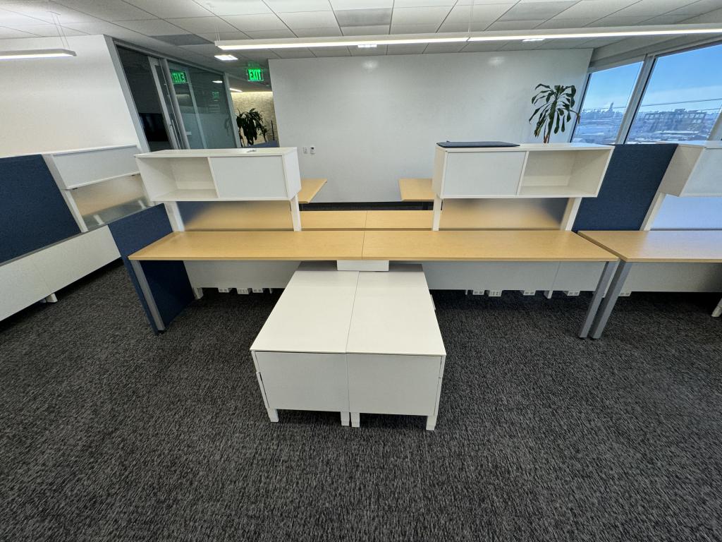Description We have these Herman Miller 6'x2'x56"T Benching stations with power down the center, overhead storage on top and a return credenza. Each overhead has a combo shelf-whiteboard for collaboration.