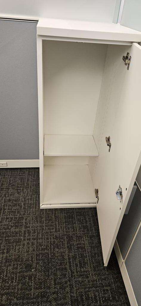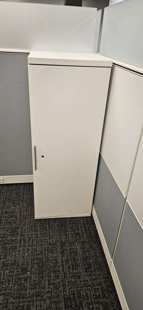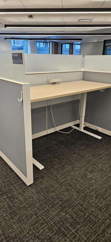 Description Herman Miller "Canvas" Workstations. Gray fabric panels with frosted glass. Each workstation has (1) white hydraulic sit to stand with Herman Miller 70" wide x30" wide maple laminate worksurface, (1) white 18" wide x 18" deep x 46" high storage tower, and white boards. Workstations are 7 ft wide by 6 ft deep. Panels are 46" high with 11" frosted glass panels on top. Overall height is 57" high. Workstations to be mostly sold as clusters.