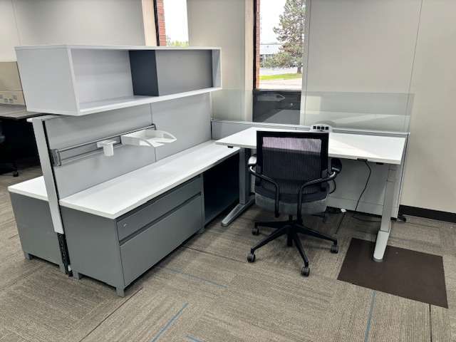 Description Steelcase OP Mobility Workstations in excellent condition! Eash station has a sit to stand desk, overhead bin, lateral file drawer, box drawer, lower storage area and tool rail.
