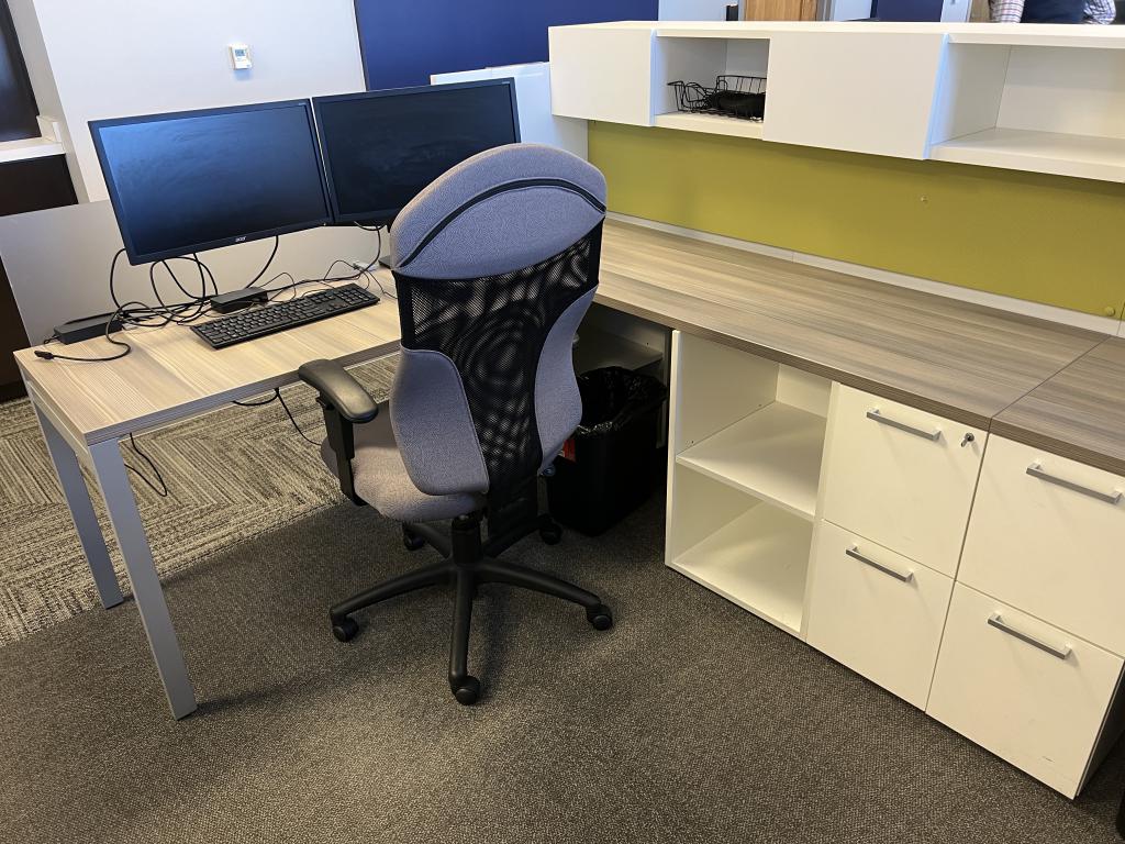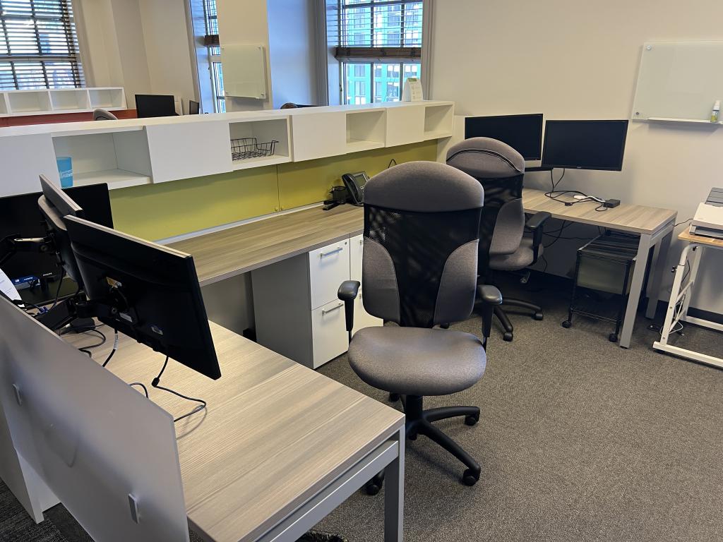 Description We are happy to introduce these elegant workstations from OFS. They are compact at 5'6"x6'x52" yet extremely functional with plenty of storage space. They have a light gray wood grain finish on the surfaces and some colorful (green / coral) interior walls to add a splash of fun to your work day. *UD_04/24* (*OP)