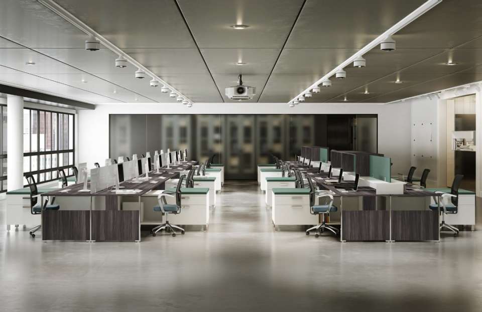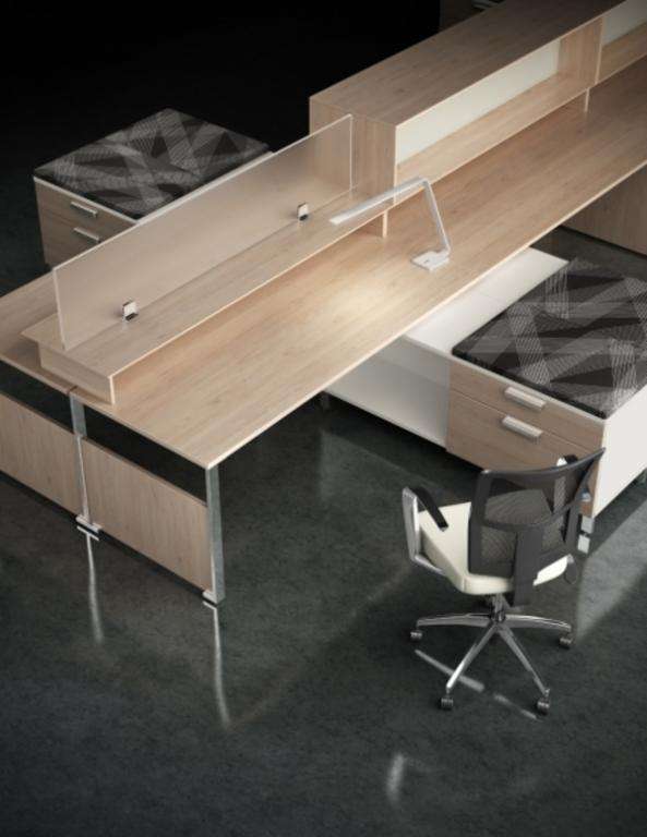 Description This Desking / Benching System allows for large open space work places with sleek designs. This is a great benching system product to fit anyone's open space needs. Many fantastic laminate finishes to choose from!
