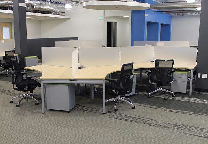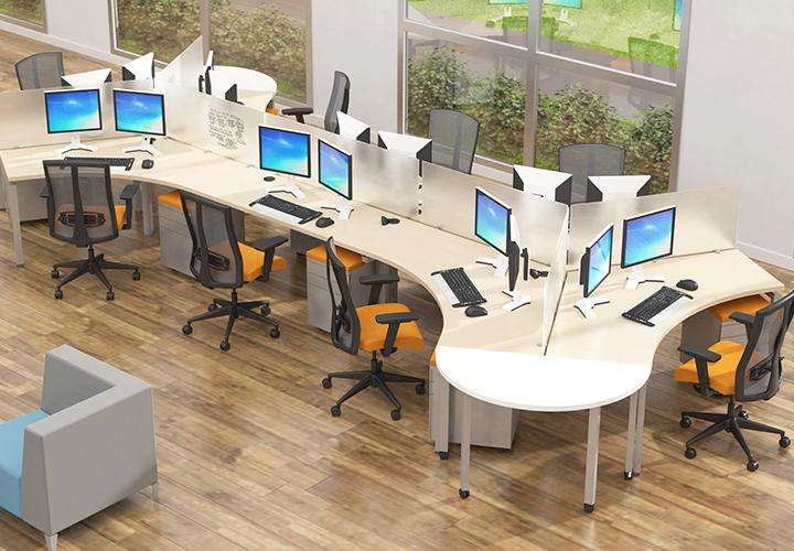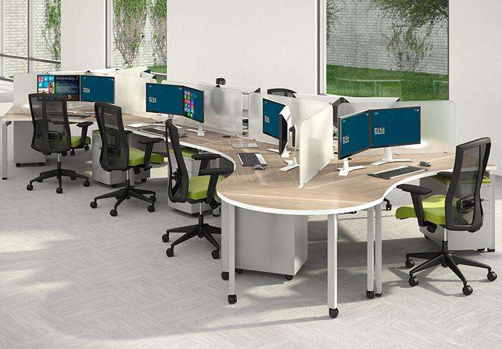 Description The ingenuity of these workstations lies in the non-linear lines of sight, meaning that no person is directly facing another. The contour of the surface also allows equal reach along all sides. BLADE 120 Degree Workstations provide an open atmosphere while enhancing your ergonomics, simultaneously.