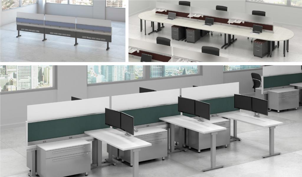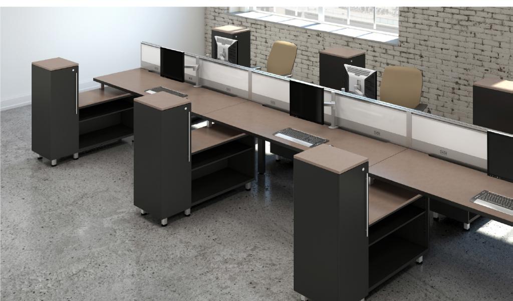 Description Modern Office Furniture Benching in Bay Area New Benching Workstations New Grid Benching Solutions. This system is modern and fun and has the familiarity of a panel system but is more flexible than standard benching products. 120 degree flexibility available with this system as well. Tiles are available in acrylic, laminate, wood,, whiteboard or a combination. Many storage options available! Please call for more details on this product.