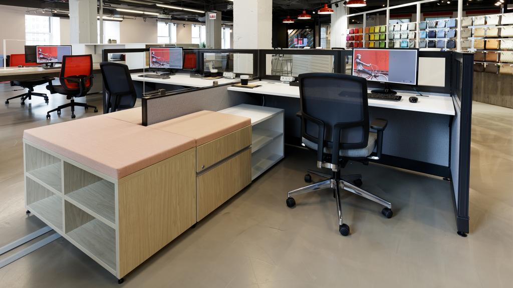 Description Two work stations, Acoustical panels, Glass stackable panels, accessible low storage opens on left and right w/ cushions, two rectangular work surfaces, Extension bookcase w/ cushion, Panel privacy screen, and work surface height powered receptacles. Available NATIONWIDE!