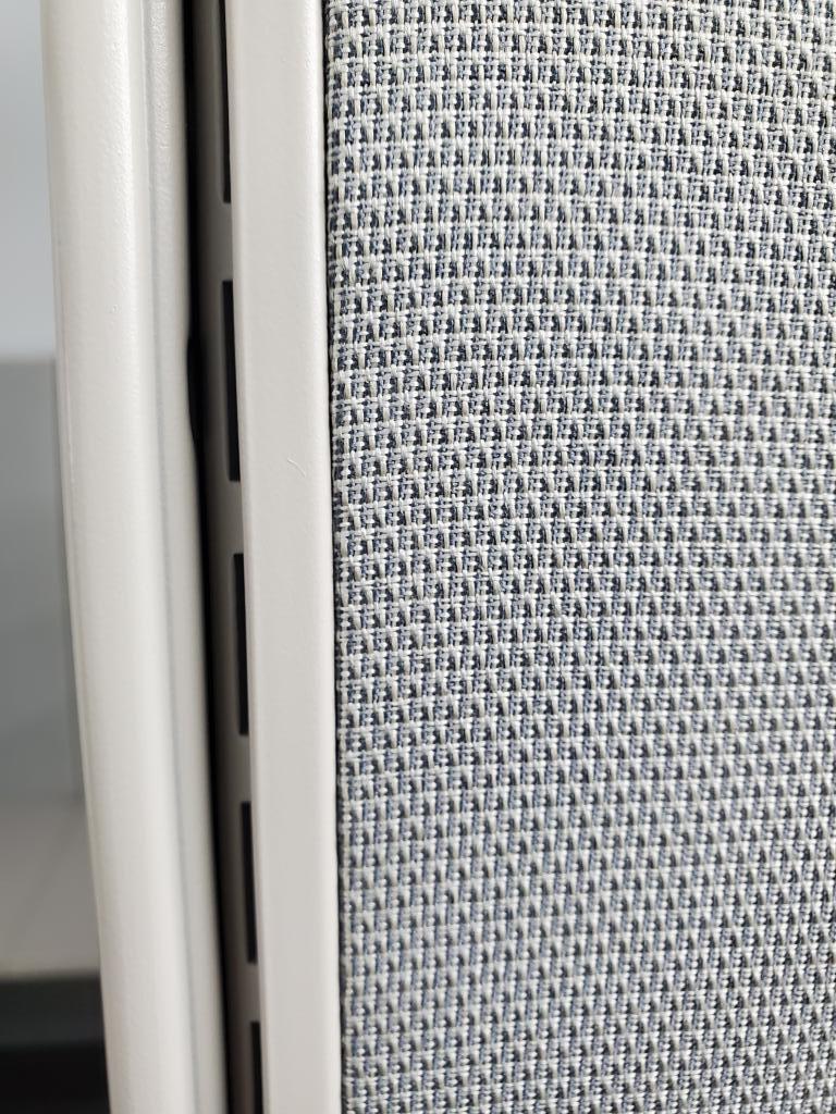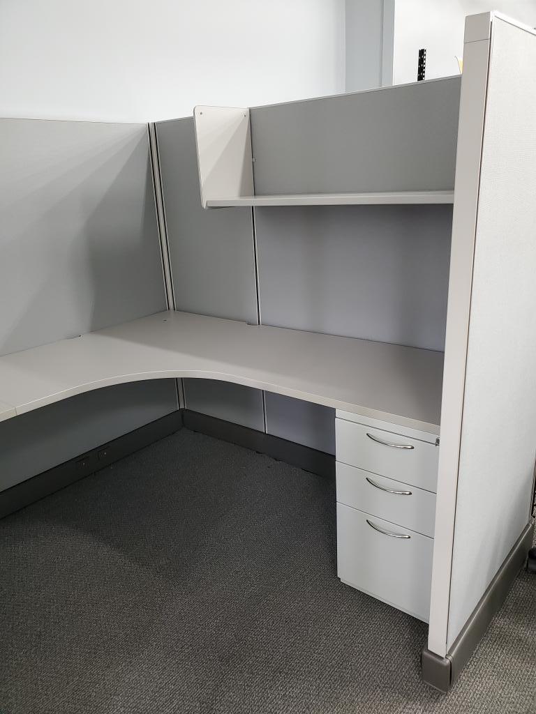 Description 6' x 6' Workstations consisting of refurbished Herman Miller AO2 67"H panels with innertone light grey worksurfaces, pre-owned Box/Box/file pedestal, and 48"W open shelf. 2 outlets per station. Panels have gray paint and MT base. Fabric is new "Engage Rain Cloud". note: Pedestal style is subject to change based on availability.