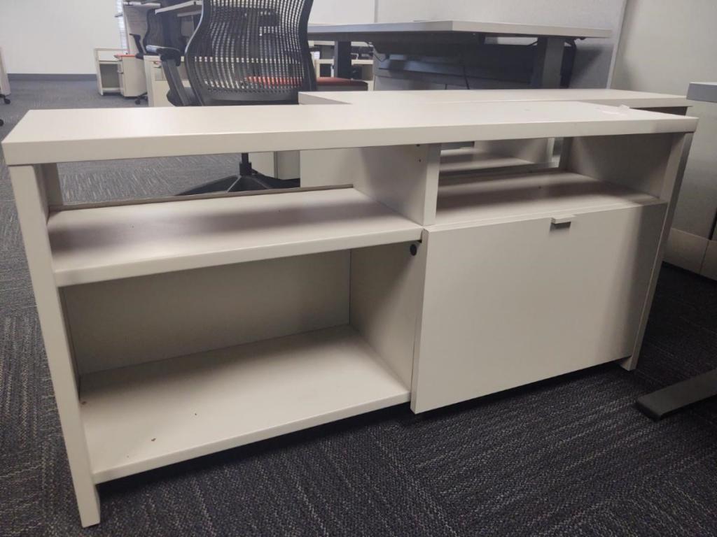 Mobile BF pedestal with cushion top and storage credenzas. Tackboard mounted on back of table. (1) side screen per table & (1) desk-height power cord. All individual units.