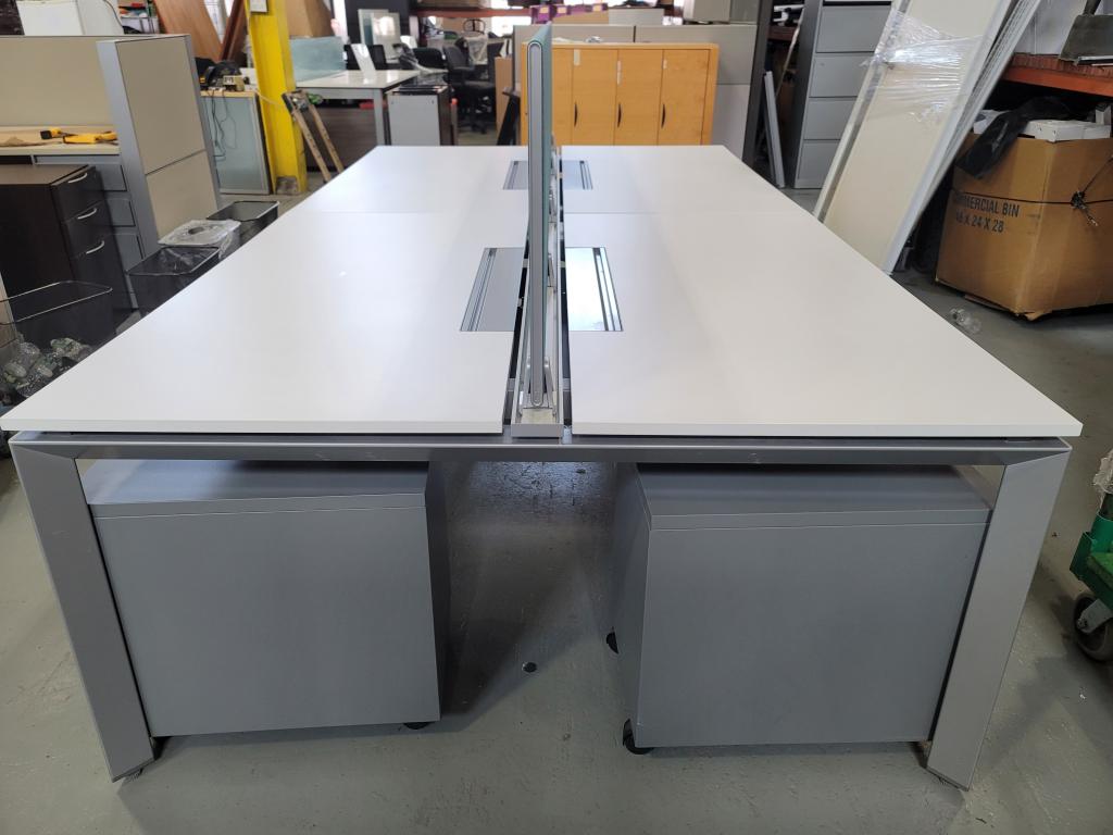 Description Steelcase Benching 30" x 54" , white surface, silver base and peds, tackable teal divider