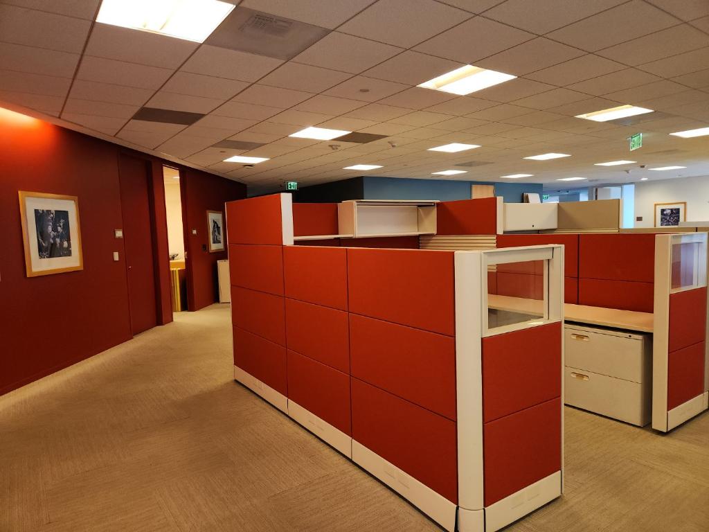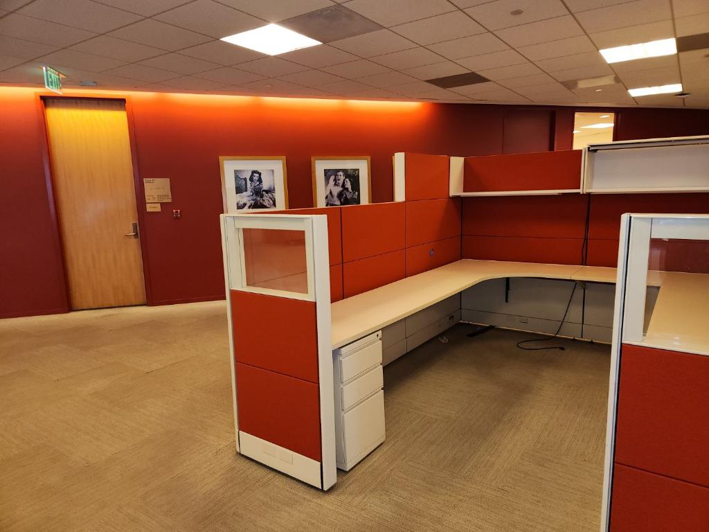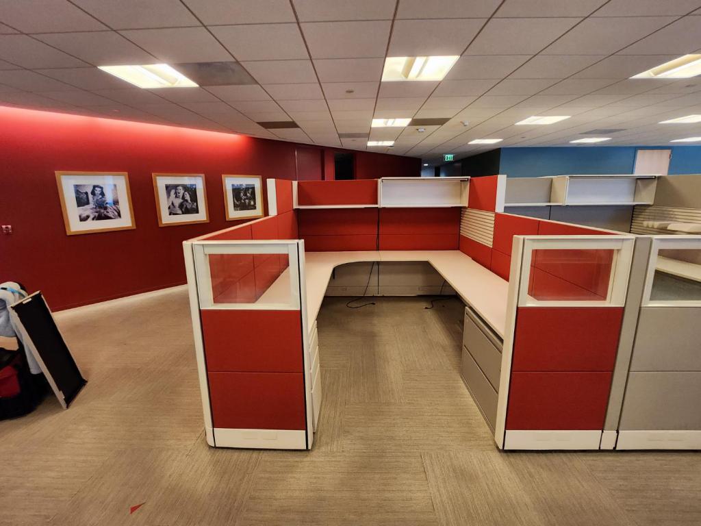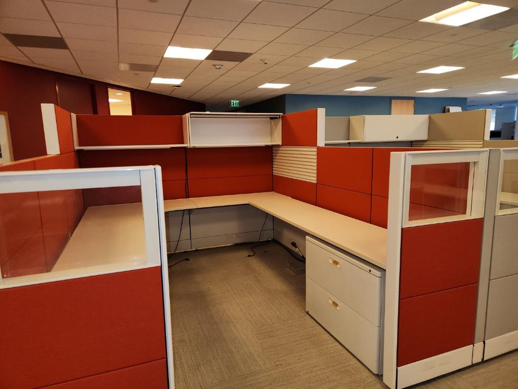 Description We have these all red tile with light tone trim Herman Miller Ethopsace stations that are 70"/54" tall and come standard as 8'x8'.