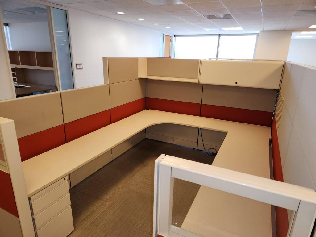 Description We have these all red & Grey tile with light tone trim Herman Miller Ethopsace stations that are 70"/54" tall and come standard as 8'x8'.