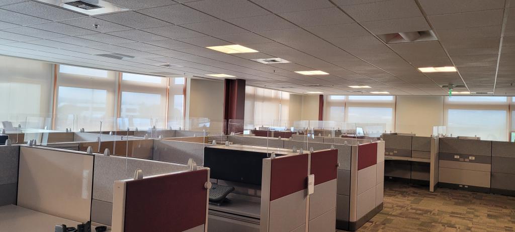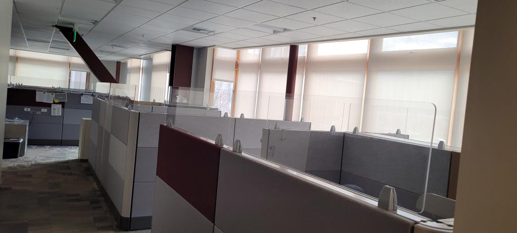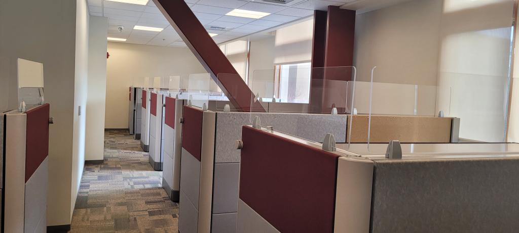 Each station comes with plexi glass risers up mounted on the panels. Also included is a overhead cabinet, BBF pedestal or lateral file cabinet .