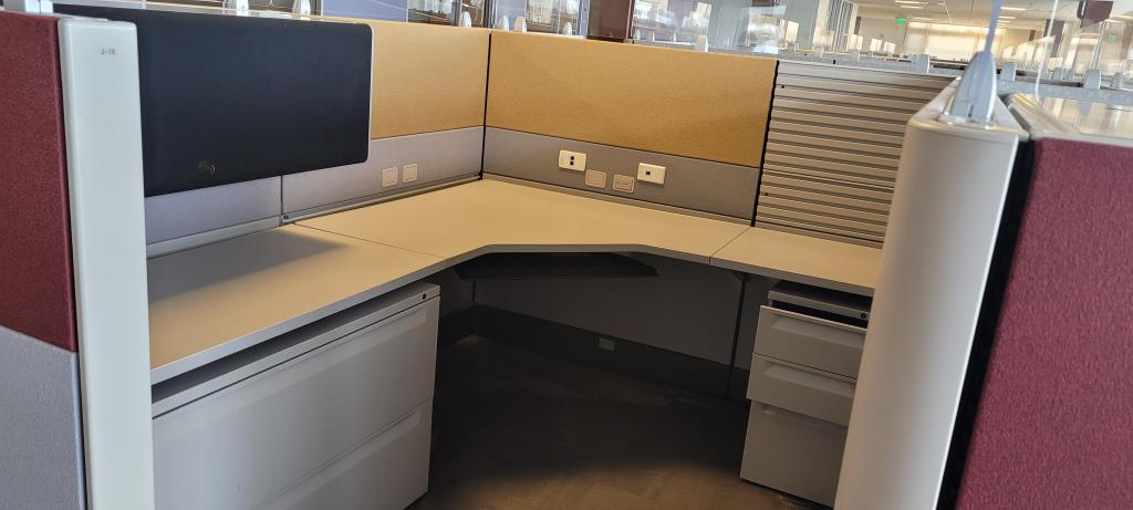 Description Herman Miller Ethospace 6'x6'x54"T. These stations come in a grey fabric with red accent tiles. They are a combination of 2', 3' and 4' panels so we can make any size at 54" tall.
