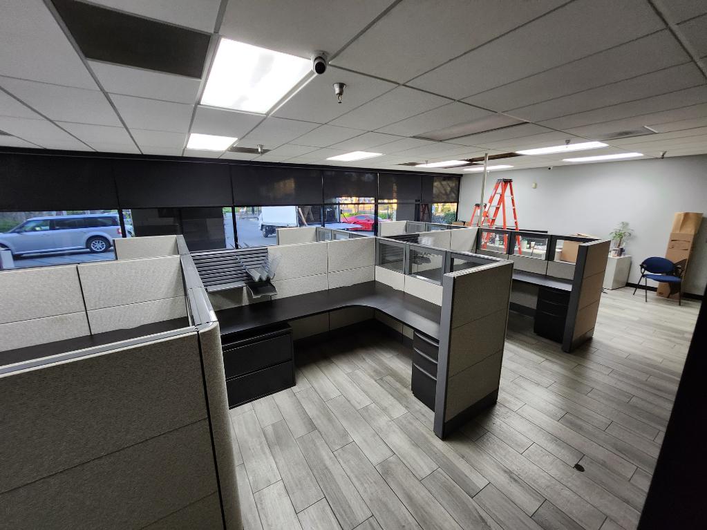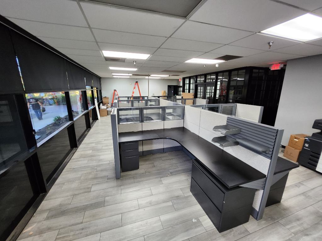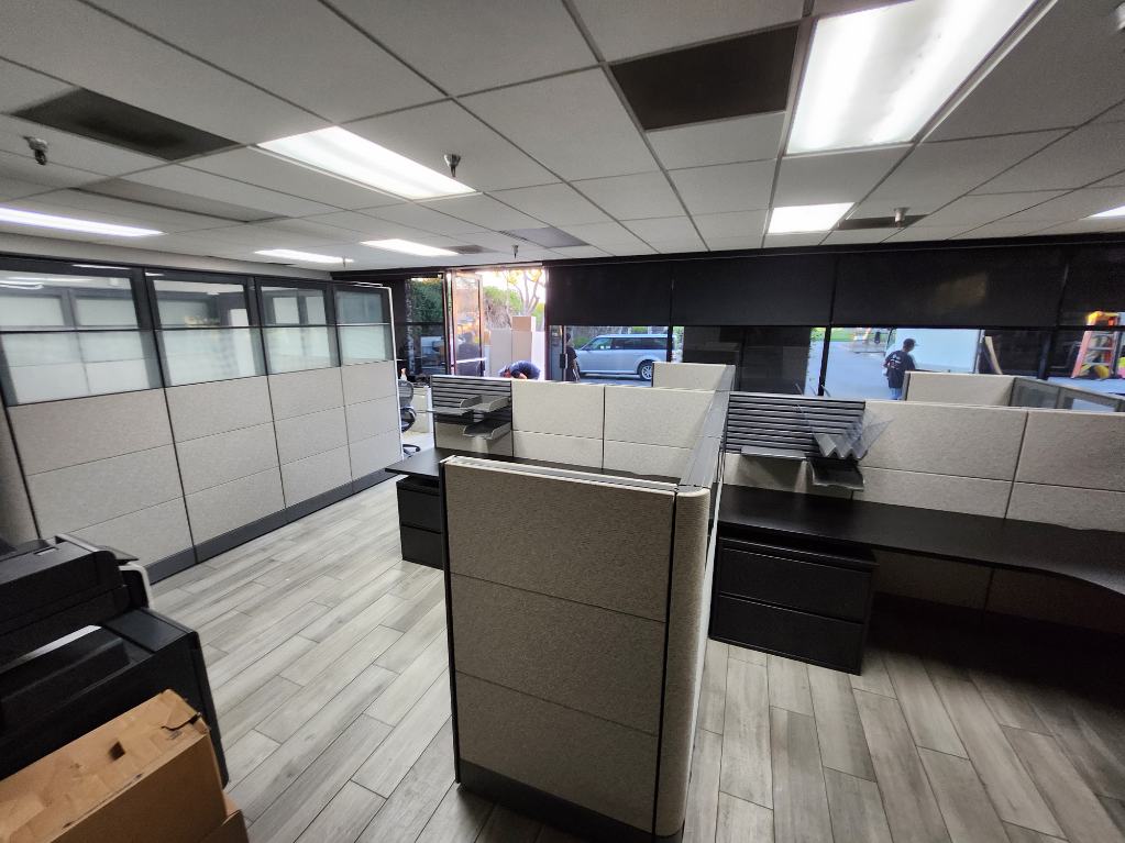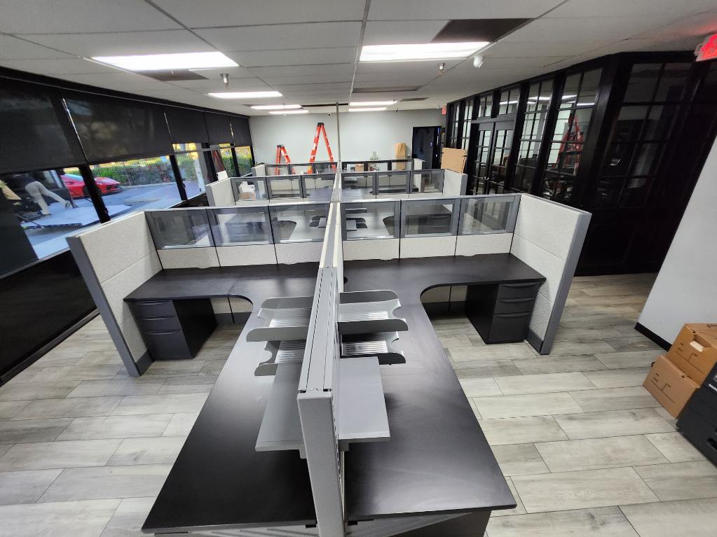 Description We have these Herman Miller Ethospace that come with grey camo fabric naturally in a 6’x8’x54”T. We can also make these into 5’x5’x54”. These are with refurbished surfaces with new black Wilsonart laminate. We can re laminate the tops to be any finish you choose. Comes with a BBF pedestal or Lateral file cabinet and paper management trays.
