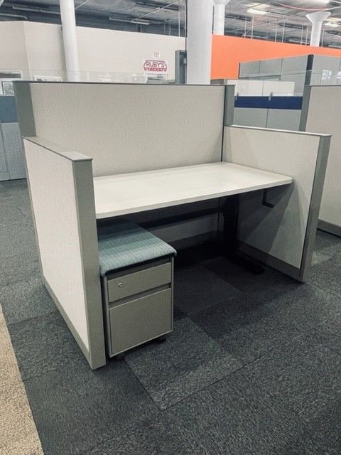 Description Pre-owned Steelcase Answer Workstation, size 3'D x 5'W x 54"/42"H. Includes seated height adjustable base with 29"D x 58"W surface, (adjusts from 22" to 33"); one (1) mobile box/file (BF) storage pedestal with cushion top. Trim/Storage Color – Fieldstone (7238), Panel Fabric Color – Pianista/Wheat (P430), Surface Color – Warm White (6655). Each workstation comes 4-circuit 3+1 power kits in base of spine panels. Power is delivered via two (2) duplex, 15A receptacles.