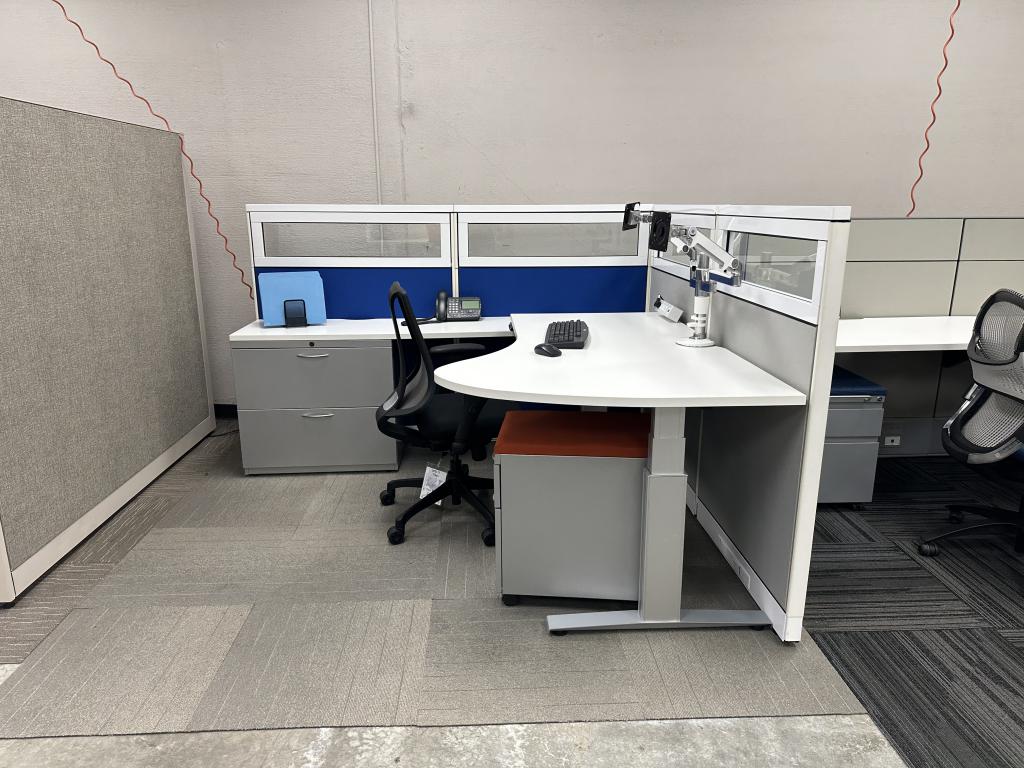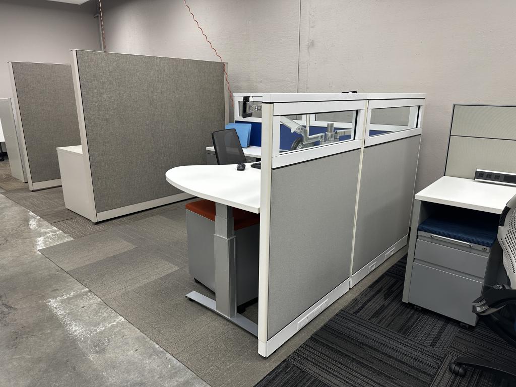 Description Sit-to-Stand desks are quickly becoming the industry standard. Lucky for you theses pre-owned stations come with them. At 52" they provide privacy when seated, but leave the office open and airy. Raise your desk to collaborate with your neighbor, and enjoy the benefits of good ergonomics. Complete with white trim and glass to keep a modern feel in the workspace. These will not be in stock long.