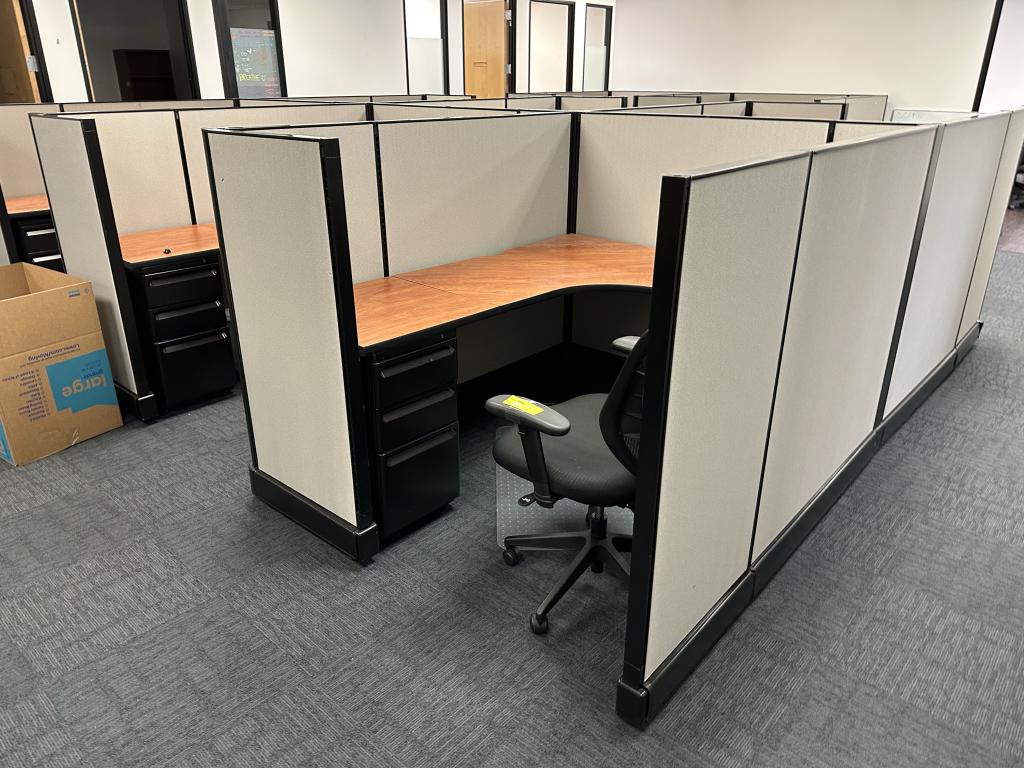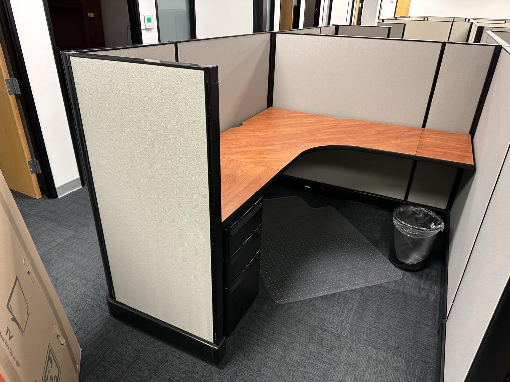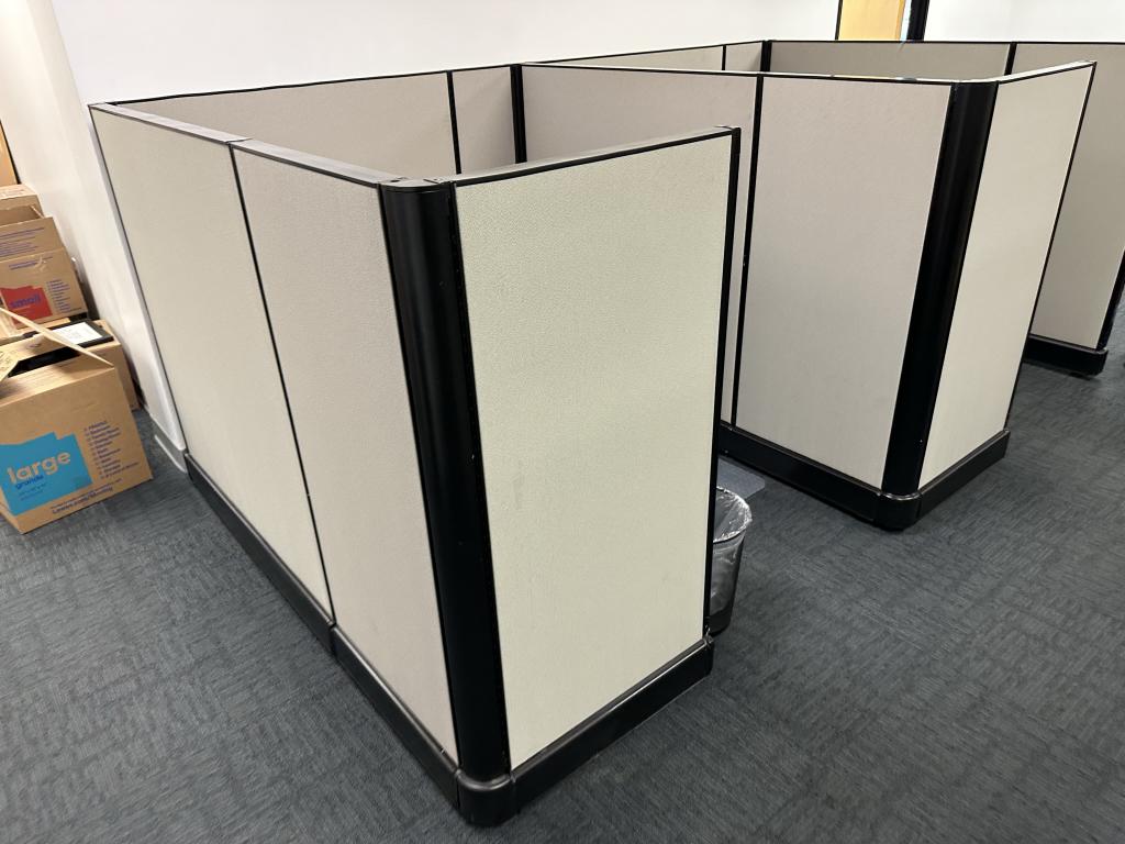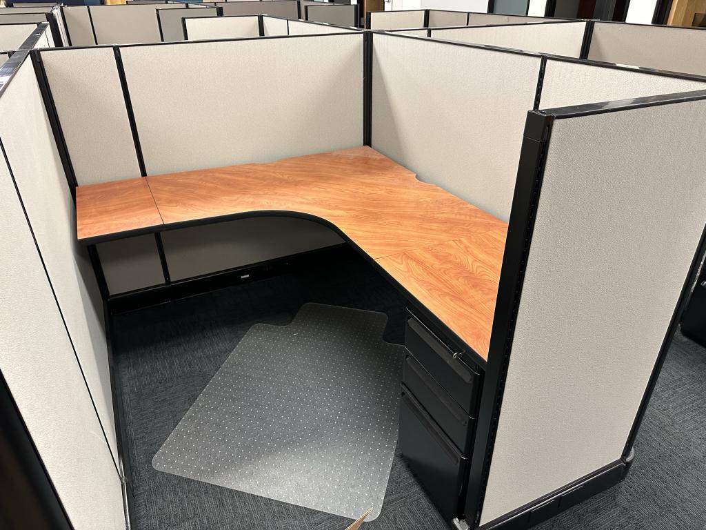 Description We have these Herman Miller A02 Dark Tone that are 5'x6'x53"T that come with a bbf pedestal and power on the spine. These stations have a beige fabric with cherry surfaces and dark tone trim.