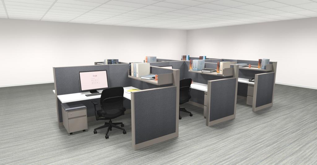 Description Refreshed Steelcase Answer Workstation, size 6'D x 6'W x 54"H. Aisle panel is 36"W x 42"H. Includes one new (1) 24"D x 72"W straight ; one new (1) 24"D x 48"W straight surface in Designer white laminate finish. ; (1) 48”W shelf unit. Trim/storage color – Fieldstone (7238), New Panel Fabric in color – GOM.Mingle/Carbon. Each workstation comes 4-circuit 3+1 power kits in base of spine panels.