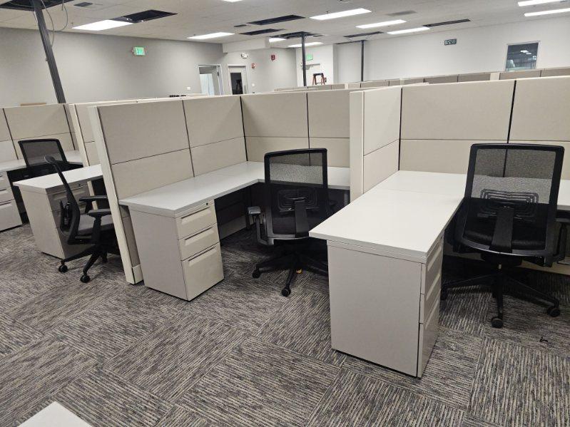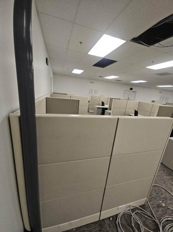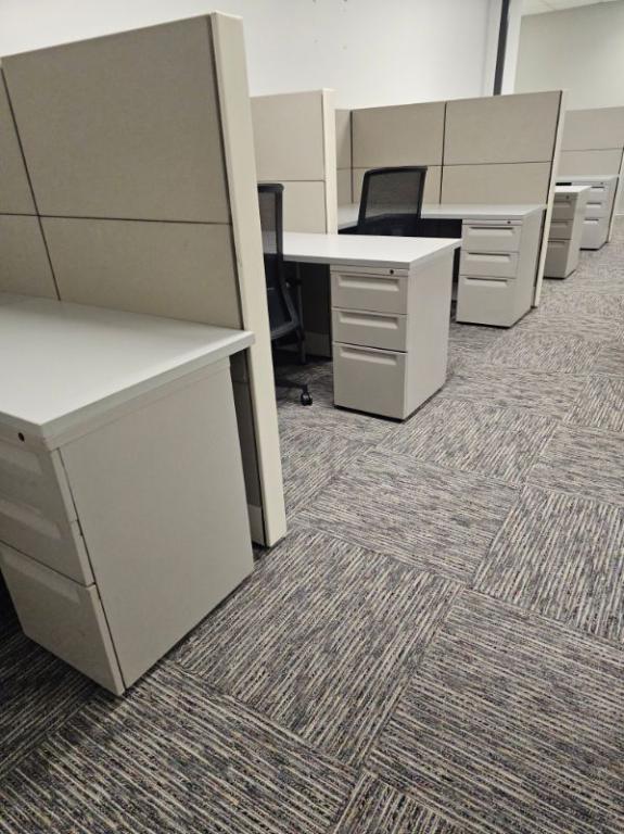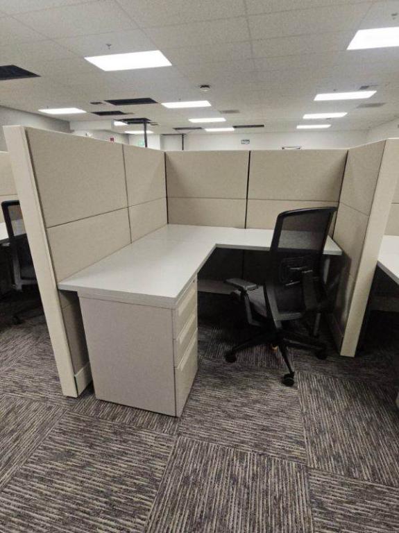 Description We have this Herman Miller Ethospace that comes in a 5’x5’ size at 54” tall. The fabric is a neutral finish with cloud white tiles and light grey surfaces.