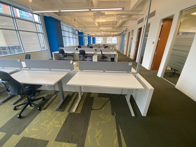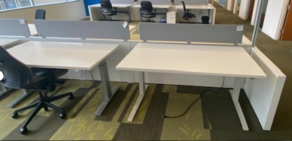Description 72x30 and 60"x30" height adjustable benching stations with White tops and Grey dividers. Silver Hat bases. Tables are free-standing and can be purchased separately.