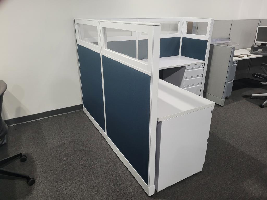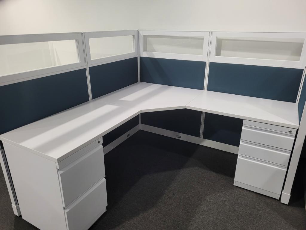 Description 6'x6'x54" white with blue fabric, corner work space. Double pedestal storage.