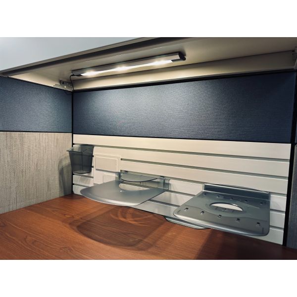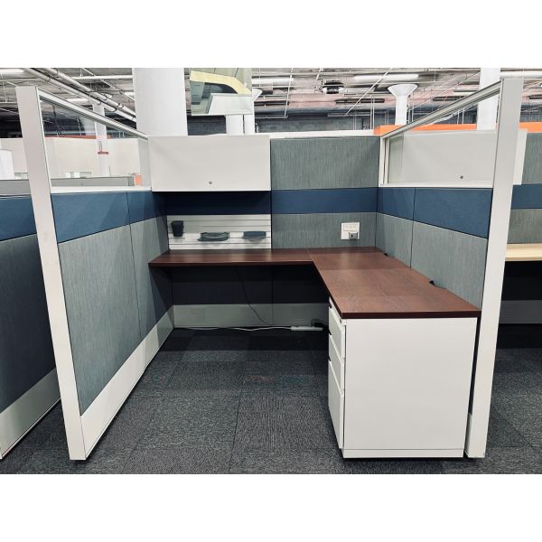 Description Pre-owned Haworth Compose Workstation (6'D x 6'W x 64"H) Includes (1) Cherry 72" W x 24" D surface, (1) 48" x 24" D Cherry surface, (1) 36"W flipper door overhead, (1) Magnet LED task light (19"), rail tile and paper management, (1) 8'W x 16"H clear glass panel. Storage Finish: Chalk (TR-0AK). Worksurface Finish: Medium Cherry (OH-0AD). Panel Finishes: Main - Striae-Beam (C1-0AJ), Accent - Shimmer-Water (WS-003), Trim/Slat Tile - Chalk (TR-0AK).
