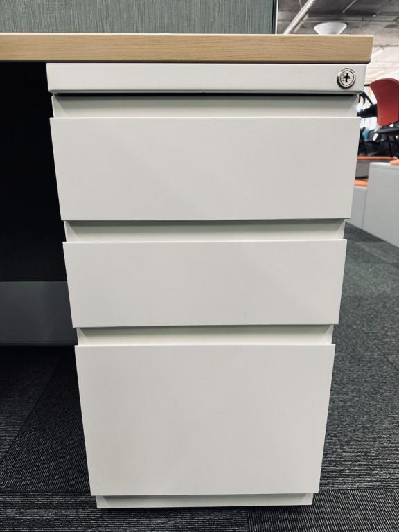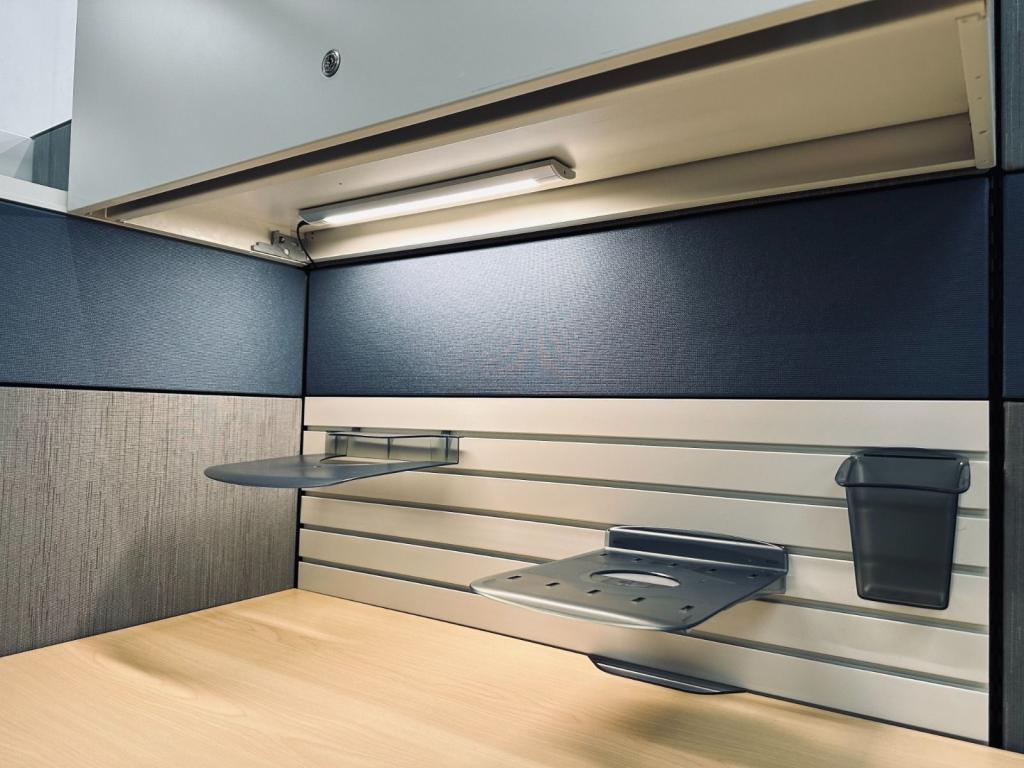 Description Includes (1) 72" W x 24" Maple D surface, (1) 48" x 24" D Maple surface, (1) 36"W flipper door overhead, (1) Magnet LED task light (19"), rail tile and paper management, (1) 8'W x 16"H clear glass panel. Choice of National Code Power, Chicago Code Power, or Non-powered. Storage Finish: Chalk (TR-0AK). Worksurface Finish: Maple. Panel Finishes: Main - Striae-Beam (C1-0AJ), Accent - Shimmer-Water (WS-003), Trim/Slat Tile - Chalk (TR-0AK). Requires a licensed electrician to connect to the building power supply. Data/IT components are not included. Pedestals are subject to change upon availability