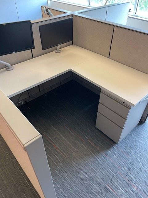 Description An Exceptional Large Block of Miller Knoll Canvas Cubes, Age: 2015, FOB: St Louis) | On Quick Ship 5x5 46"h 2 monitor arms, BBF Mobile Ped Finishes: Grey
