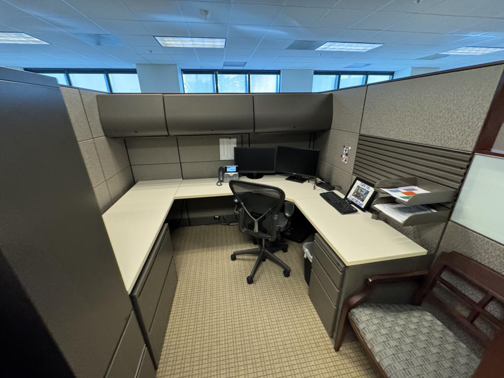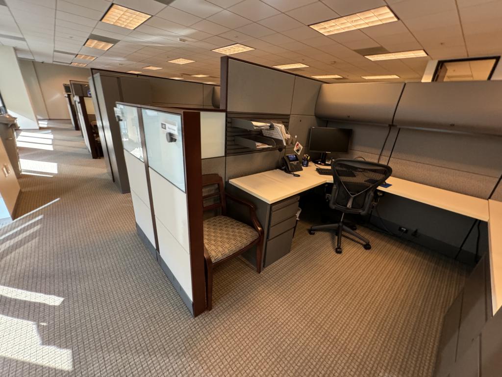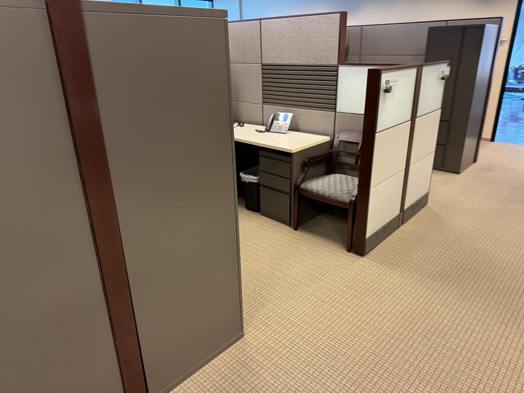 Description We have these Herman Miller Ethospace that are resembled by the Wells Fargo Herman Miller Ethospace in a rich Mahogany Veneer trim with neutral tile outside and grey tile inside.