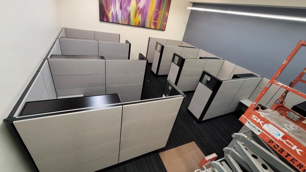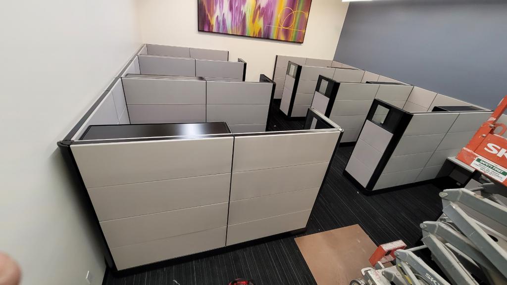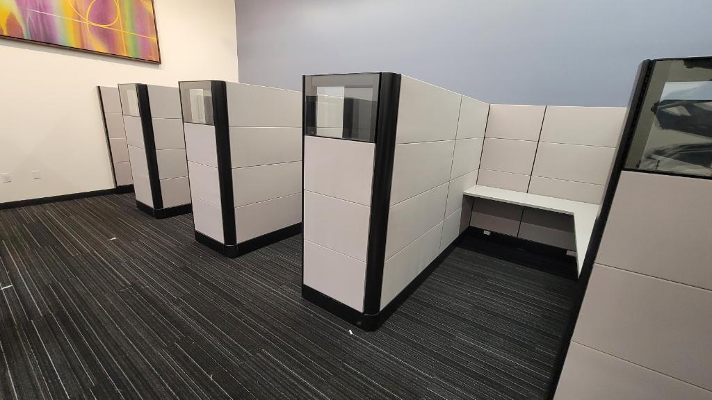 Description We have this Herman Miller Ethospace light grey panels with new fabric and painted trim to make this cubicle look similar to new refurbished condition. These stations come in 5.5’x8’ and 6’x8’ at 70” tall. Other sizes are available. Each station comes with a pedestal and overhead or shelf.
