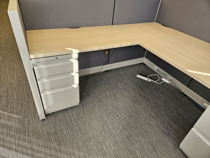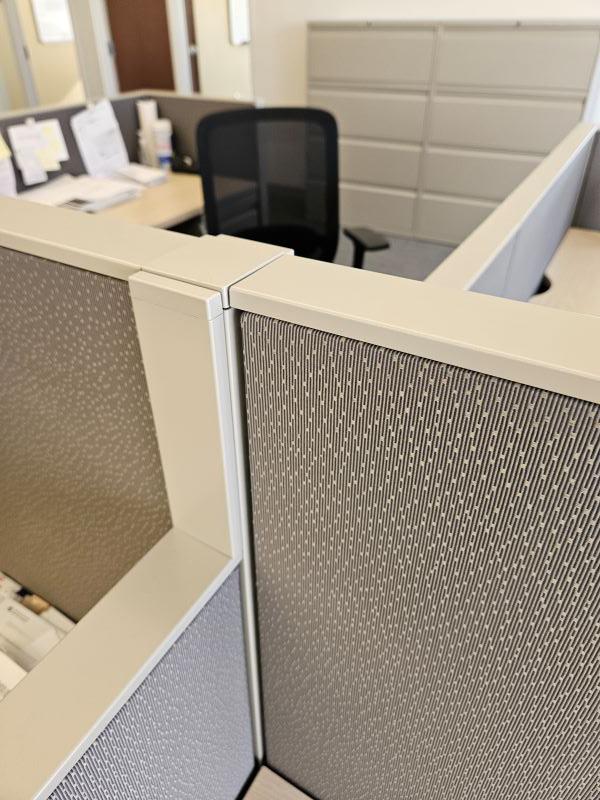 Description Maxon 6x6 workstations featuring gray fabric panels, 2 maple laminate worksurfaces, 1 box/box/file pedestal, and 1 file/file pedestal. Panels powered down center spine. Gray fabric. Metallic grey trim.
