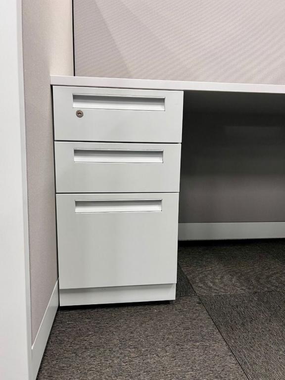 Description Renewed Steelcase Answer (6'D 6'W 66"H). Specified with l-shaped surface (24” x 72” and 24” x 48”). Storage includes top-supporting box/box/file and file/file pedestals. Finish for trim and storage is Designer White, Fabric is Essence Heather, and worksurfaces are white. May be ordered with National Code power (Power In-feeds sold separately), Chicago Code power, or Nonpowered. Data Components not included. Features frameless bracket-mounted glass.