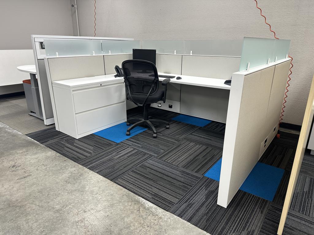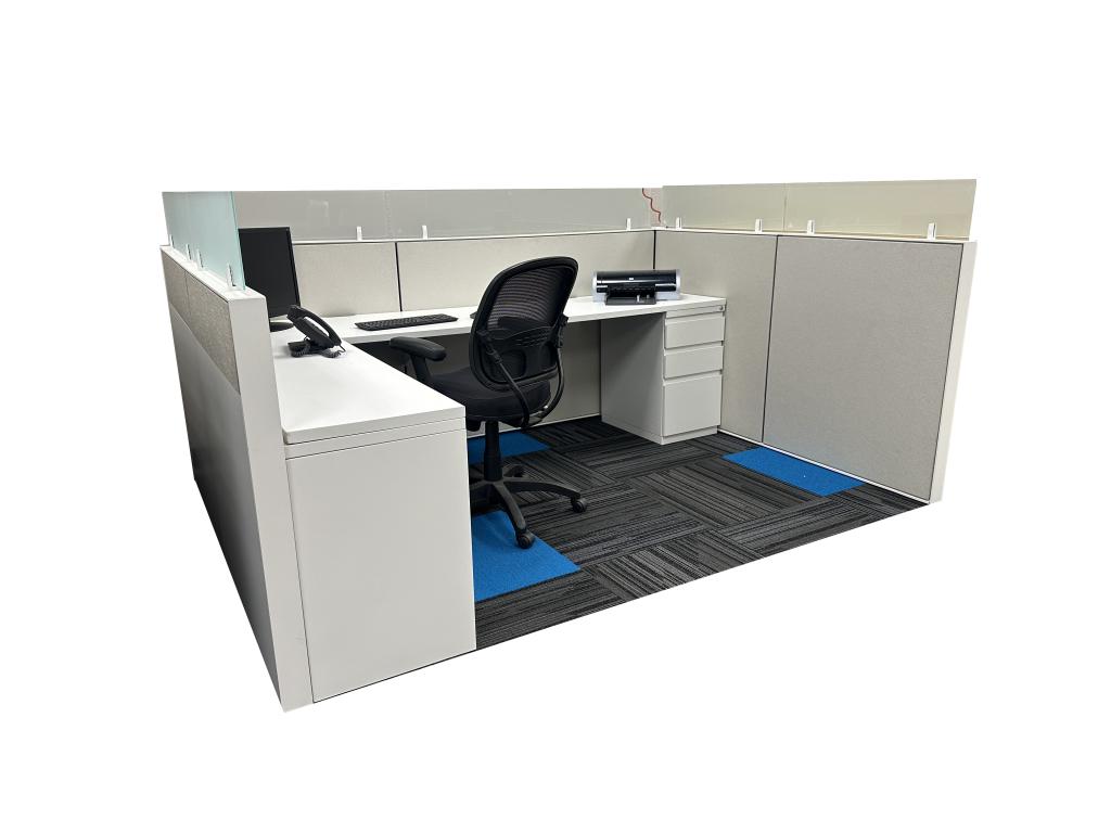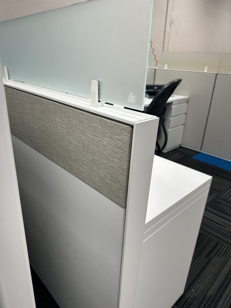 Description Would you look at these light and bright Haworth Compose stations? These are seated privacy with frameless glass stackers. Pictures shown are 8x6 but we can also make them into 6x5' size. With this look these stations won't last long.
