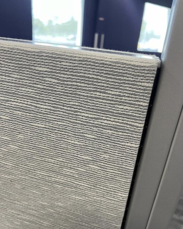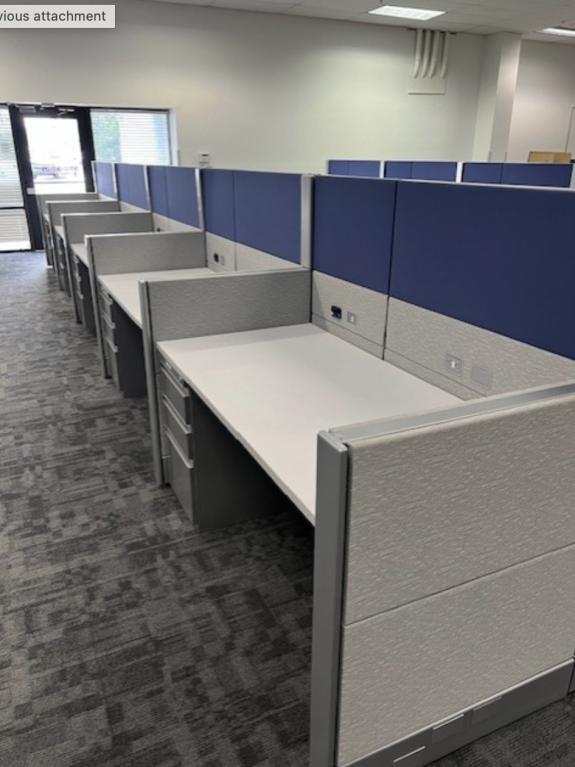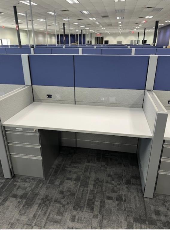 These stations come with beltline power, silver trim blue and grey fabric. The spine is made up of a 24" and 36" powered panel and the aisles of 30" non powered panels.
