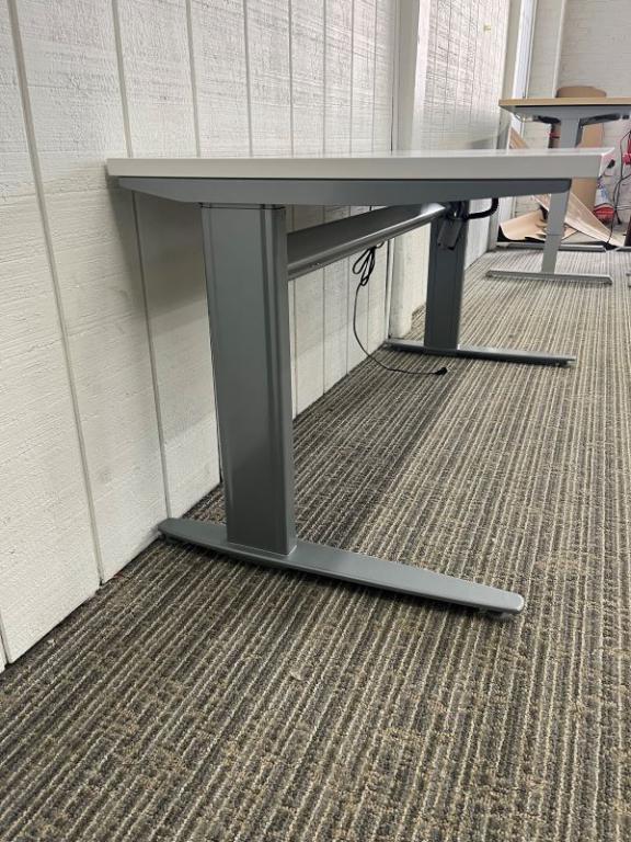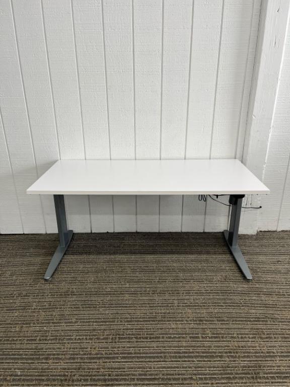 Description ConSet Electric Sit to Stand Desk with White Laminate Top Dimensions: 57" wide x 27" deep. Height Range: 27" - 47" tall. ConSet-Silver Base (various base styles)