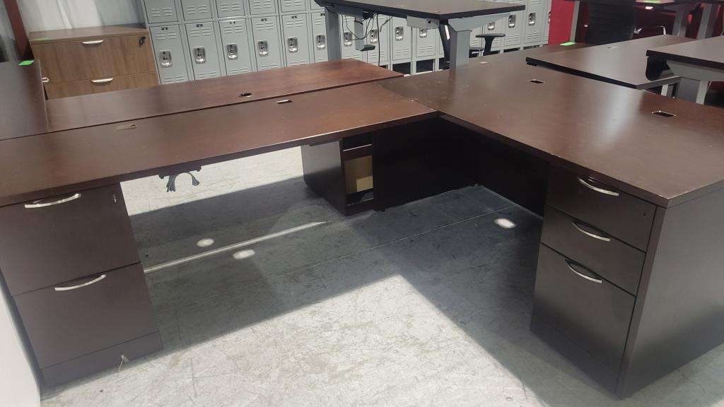 Description Espresso L-Shape Desk (2 Available). Marked down to $525 from $625! 100 x 72. Two pedestals, with two box drawers and three lateral files. Grommet holes for wires. Perfect addition to a home office or work space. Spacious desk for all your working needs.
