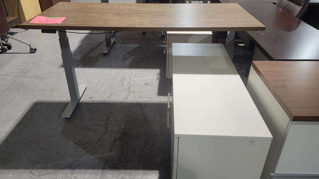 Description 5.5 Ft Walnut Sit-Stand Desk. Choice Sit-Stand Desk, fully electric with a 4 Ft White Return Credenza. Credenza has two inner shelves, one box drawer, and one lateral file drawer. Height-adjustable, ergonomic desk marked way below retail price.