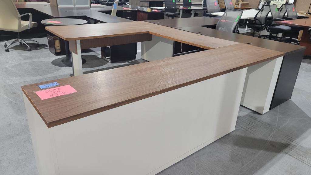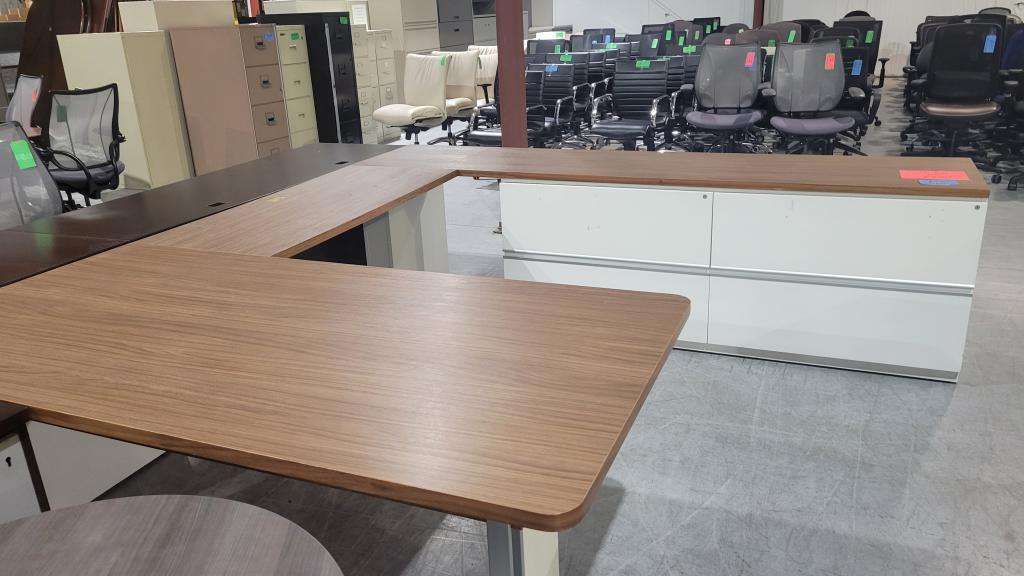Description Walnut and White Modern U-Shape with Hutch. 105 x 72. Marked down to $650 from $750! Large desk with 4-drawer lateral files and a hutch. Walnut laminate surface with white accents and full modesty panel.