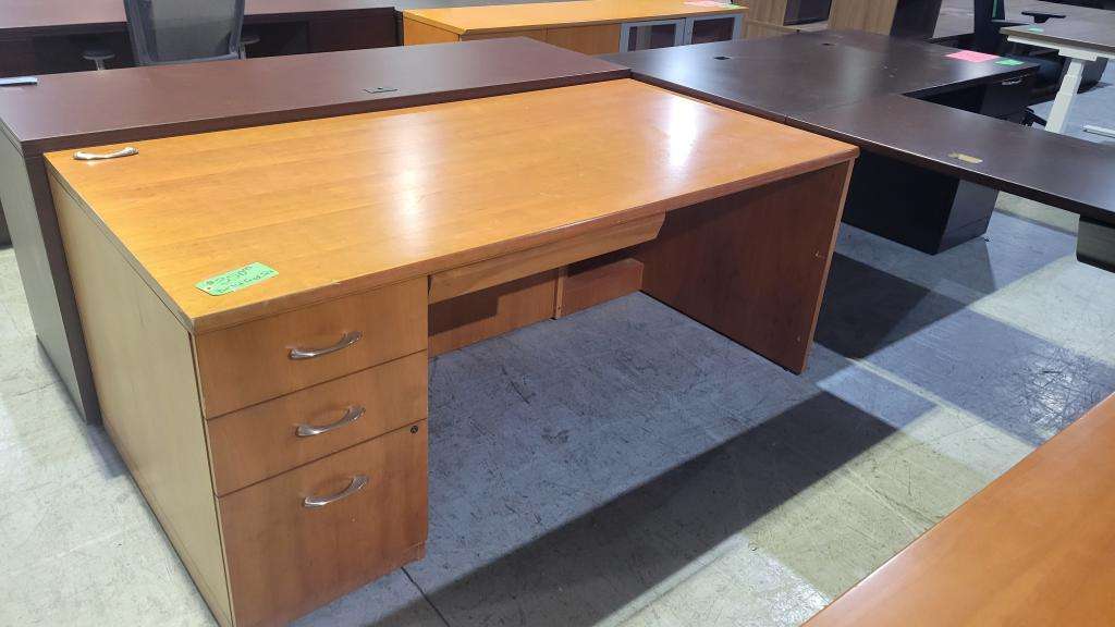 Description Maple Desk and Credenza Set. Desk is 70 x 35.5, and Credenza is 70 x 24. Comes with 2 box drawers, 1 vertical file, and 2 lateral file drawers. 1 Handle needs to be re-attached.