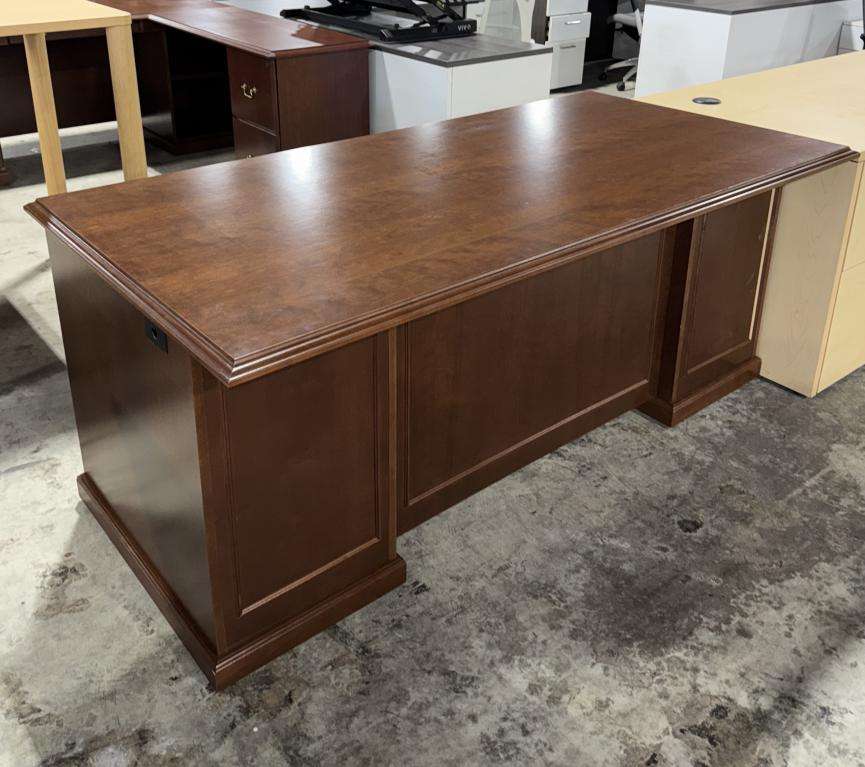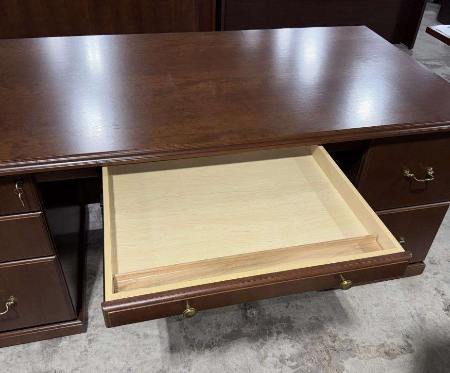 Description This traditional desk features a rich walnut finish, complemented by classic brass curved handles with rosettes that add a touch of elegance. It offers ample storage with a box/box/file drawer on one side for organizing small supplies and documents, and a file/file drawer on the other side for hanging folders and larger paperwork. The center drawer provides a convenient spot for everyday essentials. Its sturdy construction and timeless design make it a perfect addition to any home office or professional workspace.*WHS_1024*