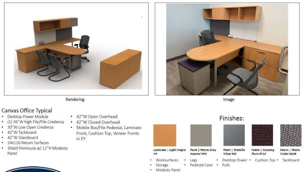 Description Pre-Owned Herman Miller Canvas Private Office Sets Canvas Office Typical: - Desktop Power Module - (1) 36”W Lateral File Credenza - 30”W Low Open Credenza - 42”W Tackboard - 42”W Glassboard - 24x116 Return Surfaces - 30x60 Peninsula w/ 12”H Modesty Panel