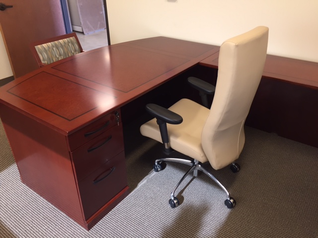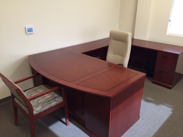 Description New office desks available in several shapes; L Shaped, U Shaped and Rectangular. You can choose a bow front or straight front. Add a credenza, hutch and a lateral file for more storage space. Offered in several laminate and veneer colors and finishes. A 42" small meeting table and side chairs complete the space.