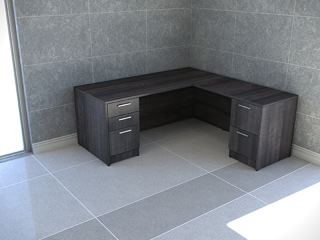 Description This L-Shaped desk has one box/box/file and one file/file pedestal, along with a right hand return. This desk is available in multiple laminates. Quantity discounts are available
