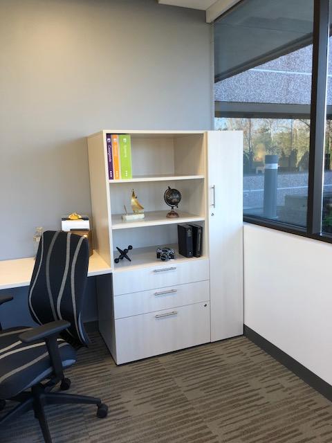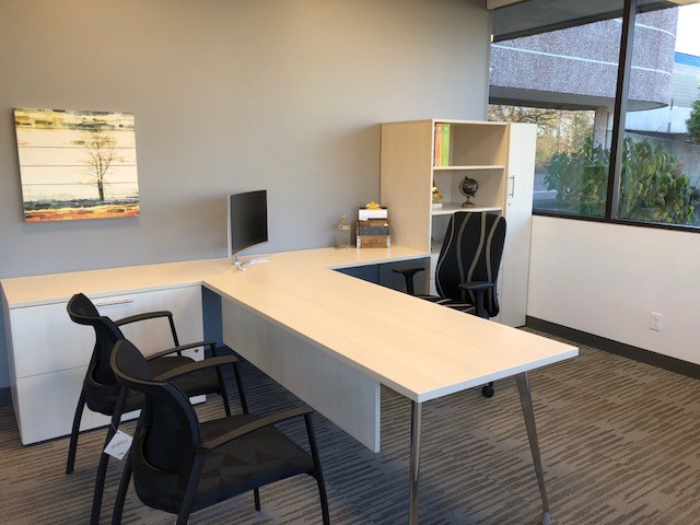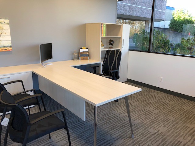 Description New Modern L Shaped desks with modesty panel available in a variety of laminates. Matching lateral files, credenzas and bookcases available.