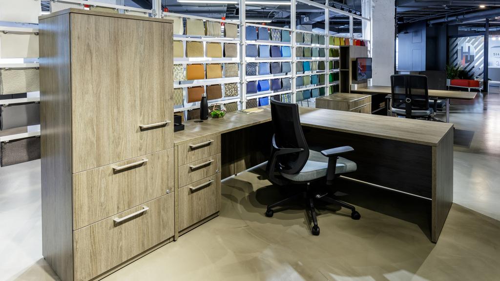 Description This upgraded open office includes: desk shell 30"P, return shell, modular pedestal, and storage unit w/ lateral file! CHAIR NOT INCLUDED IN PRICE BUT OPTIONAL: Upswing task Chair: $469 Available Nationwide. ***FREE SHIPPING OVER $5,000