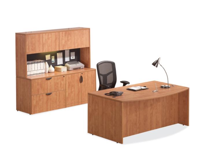 Description Desk and credenza set that includes a hutch, a two drawer lateral, a two door storage cabinet and a tack board.