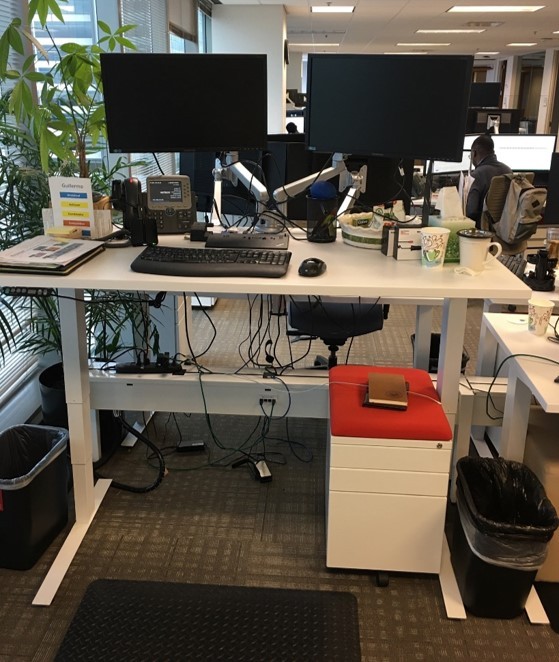 Description Clear Design Height Adjustable Desk w/Dual Monitor Arm, Mobile File Pedestal w/Seat Cushion & Programmable Remote. Beautiful Condition, Less Than 18 mo.s Old! White Work Surface, White 2 Stage Motor Legs, White Pedestal w/Orange-Red Cushion, Silver Monitor Arms.