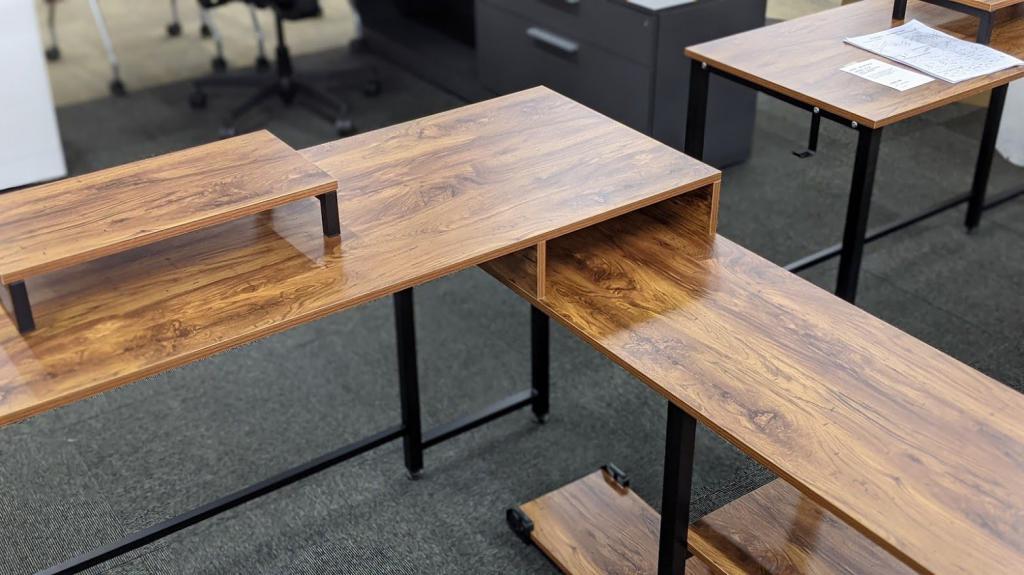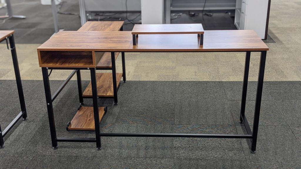 New Gelibo L-shaped desk has Rustic Brown surfaces with black metal frame, (1) display tray , and (1) New Gelibo L-shaped desk has Rustic Brown surfaces with black metal frame, (1) display tray , and (1) computer tray. Dimensions: 60"D x 56"W x 31"H. -A GRADE-